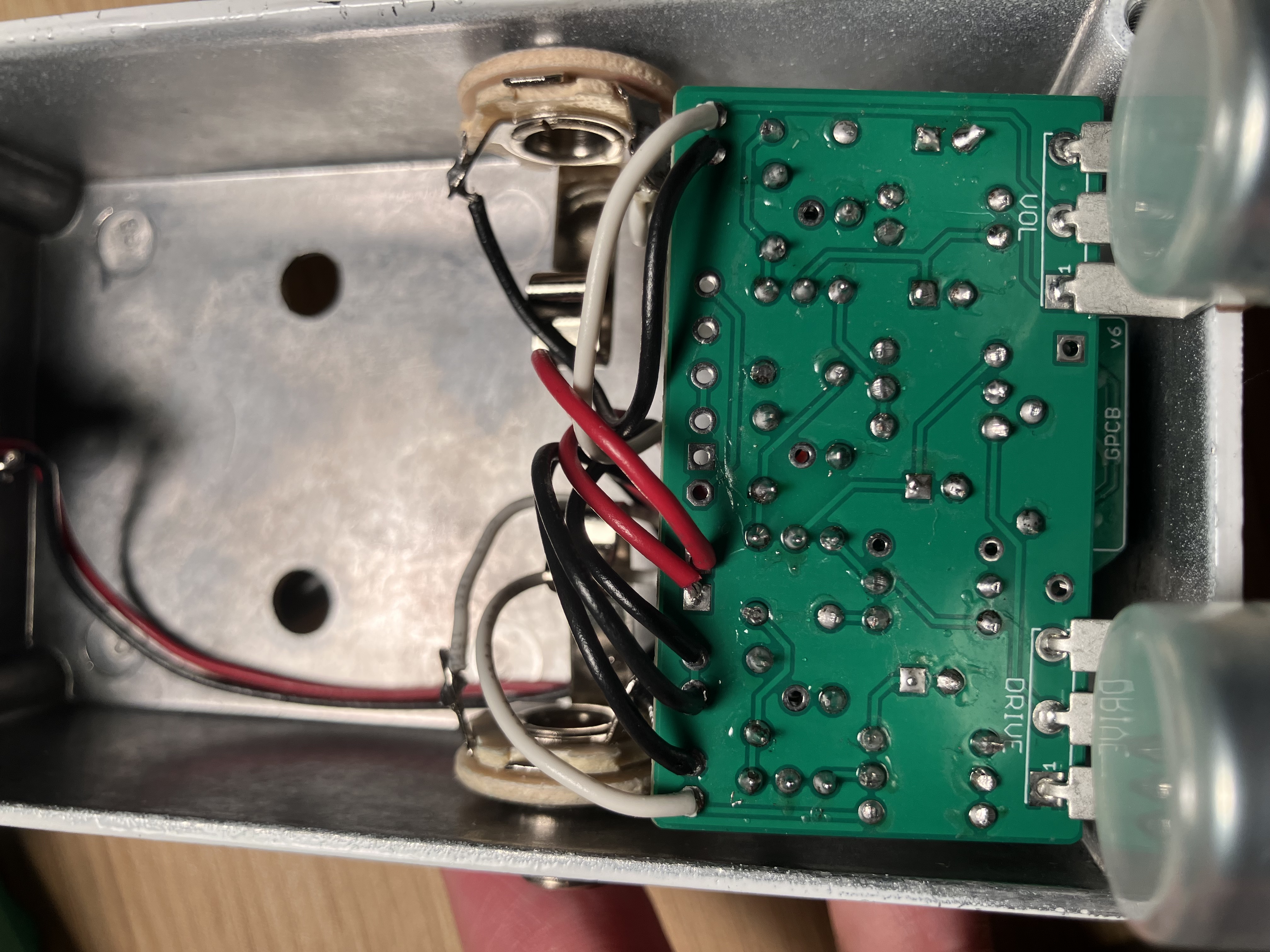 I built a Bass OD and am having some issues. The volume knob does virtually nothing and the gain knob is crazy loud/distorted by 10% on the pot. The signal powers on, passives signal in both bypass and engaged, and I biased each transistor to 5V; any idea what could be going on here?